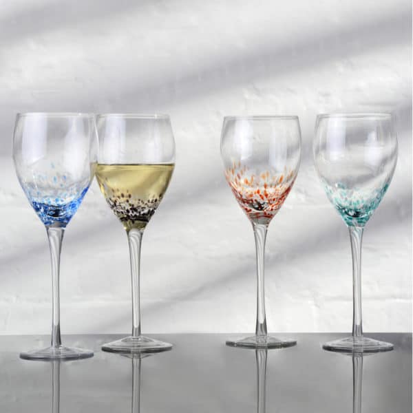 Set of 4 wine glasses featuring a mixture of assorted coloured and white glass pebbles hand rolled onto the base of the glass