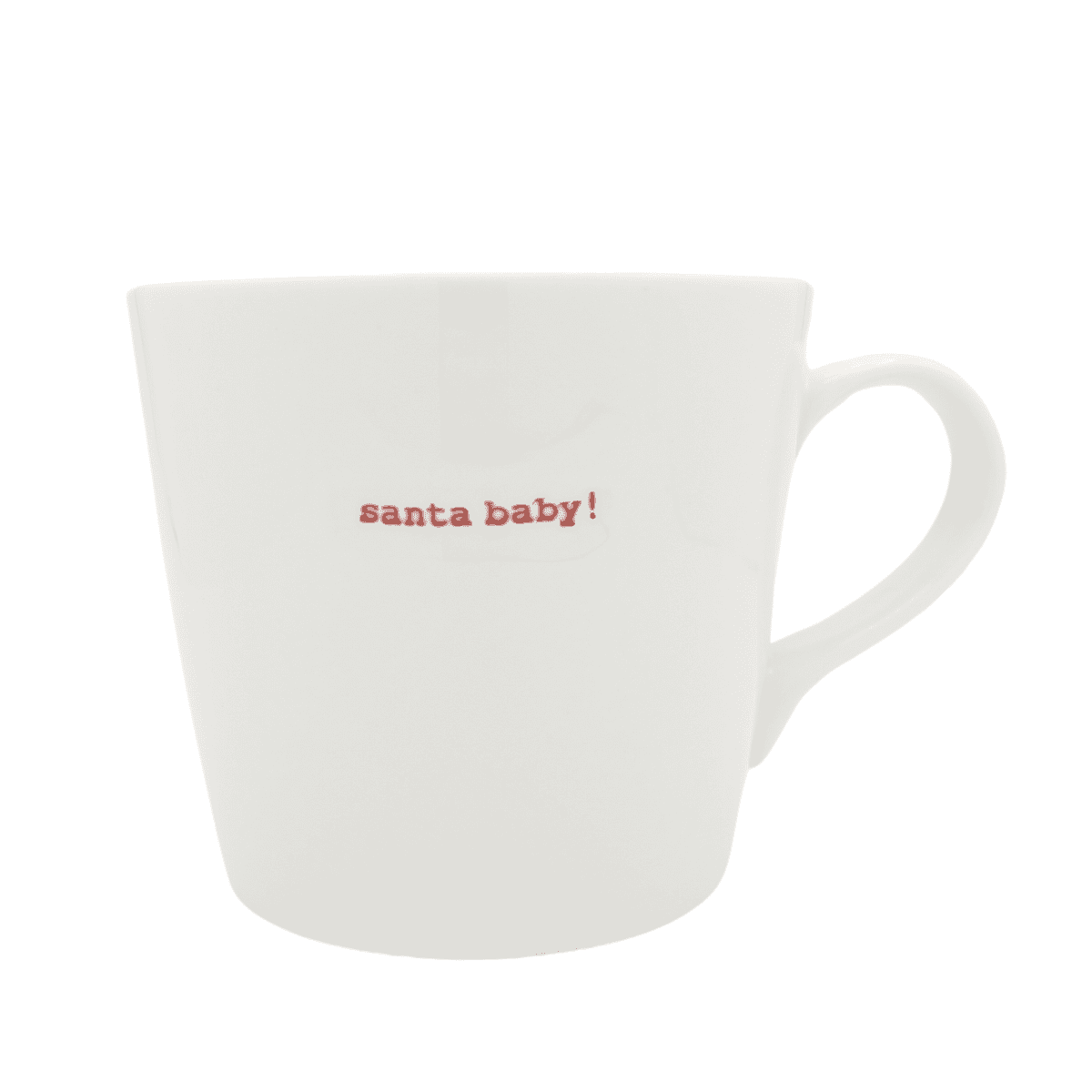 – Design: bucket-style mug with wide opening and nostalgic typewriter-font slogan “Santa Baby!” in festive red; part of the Word Range series