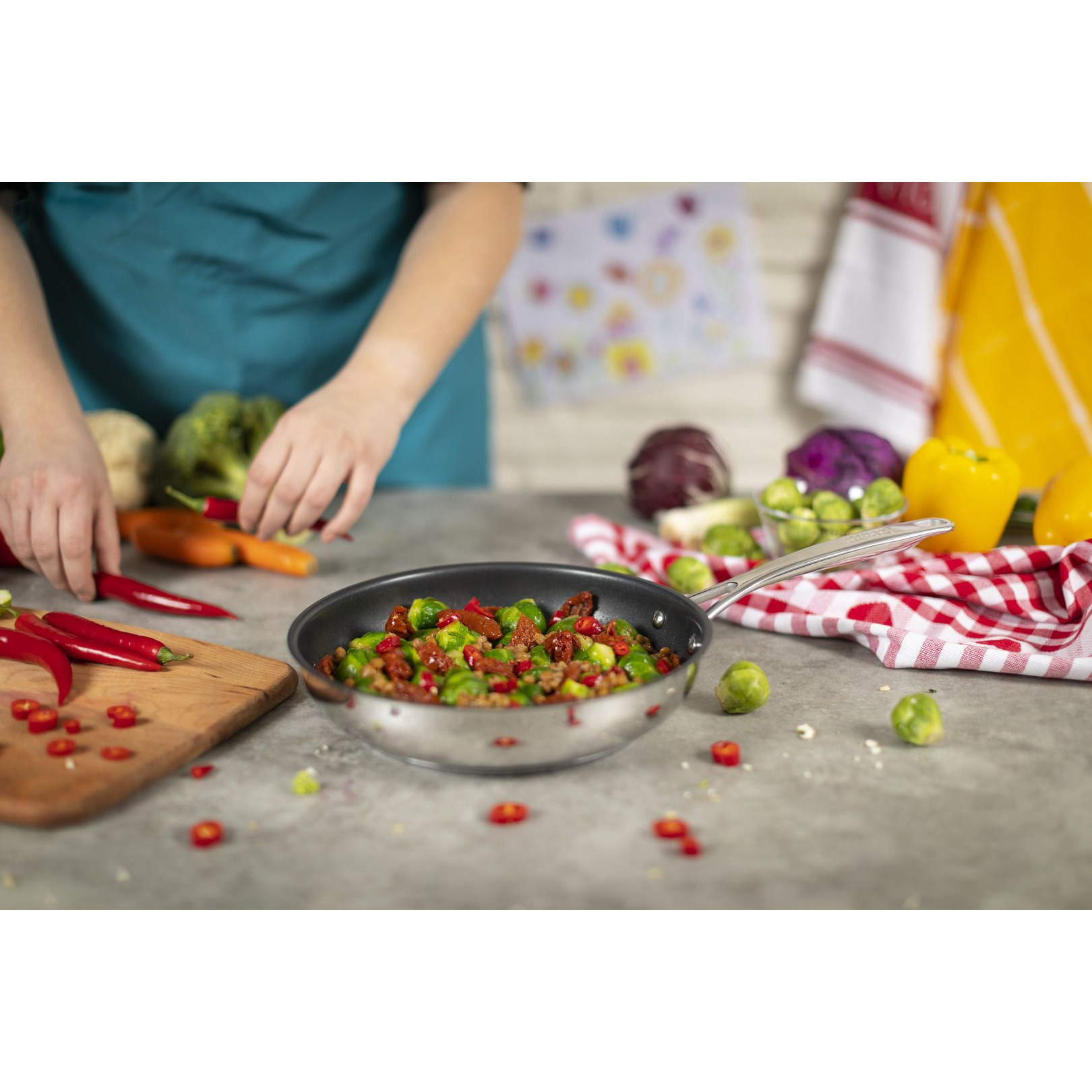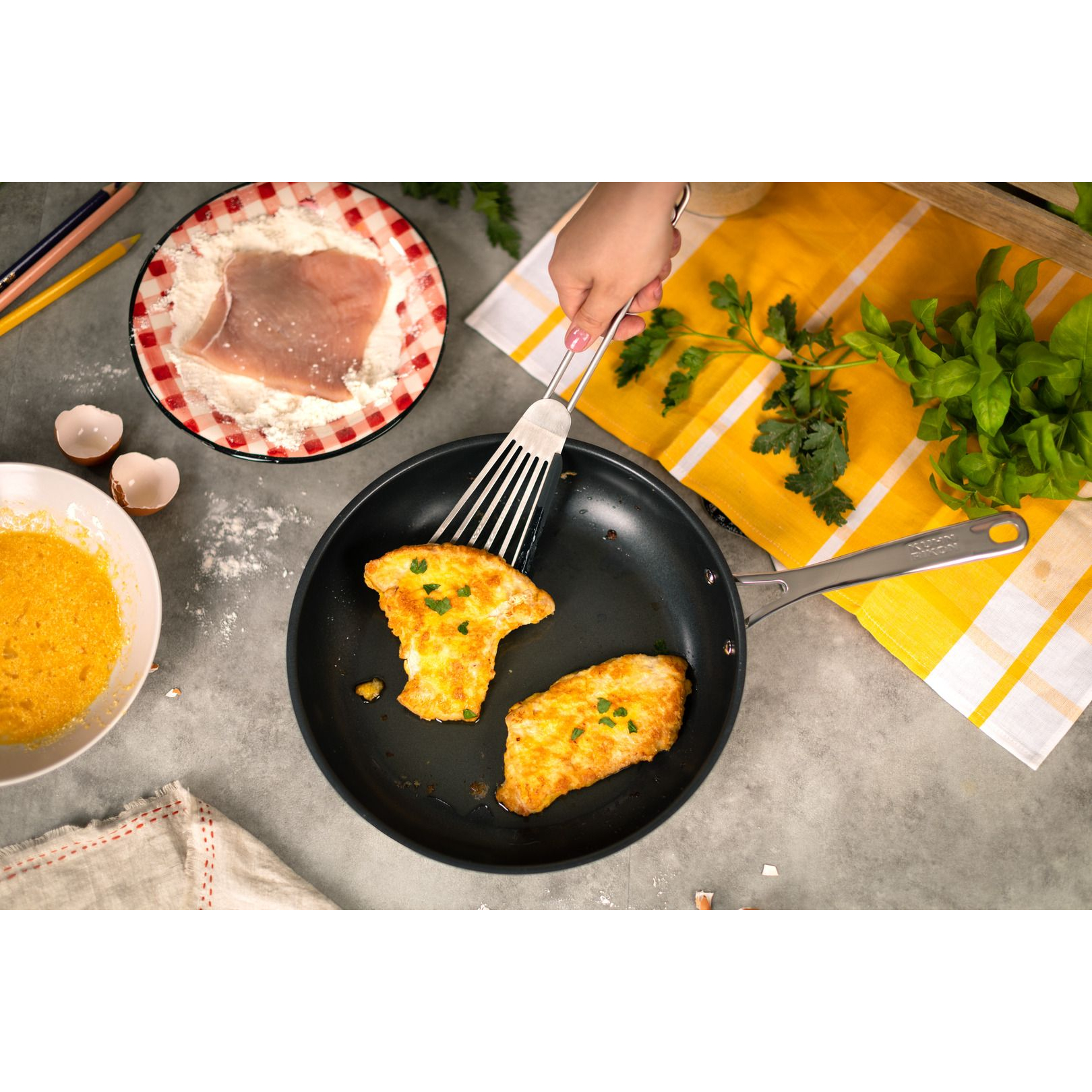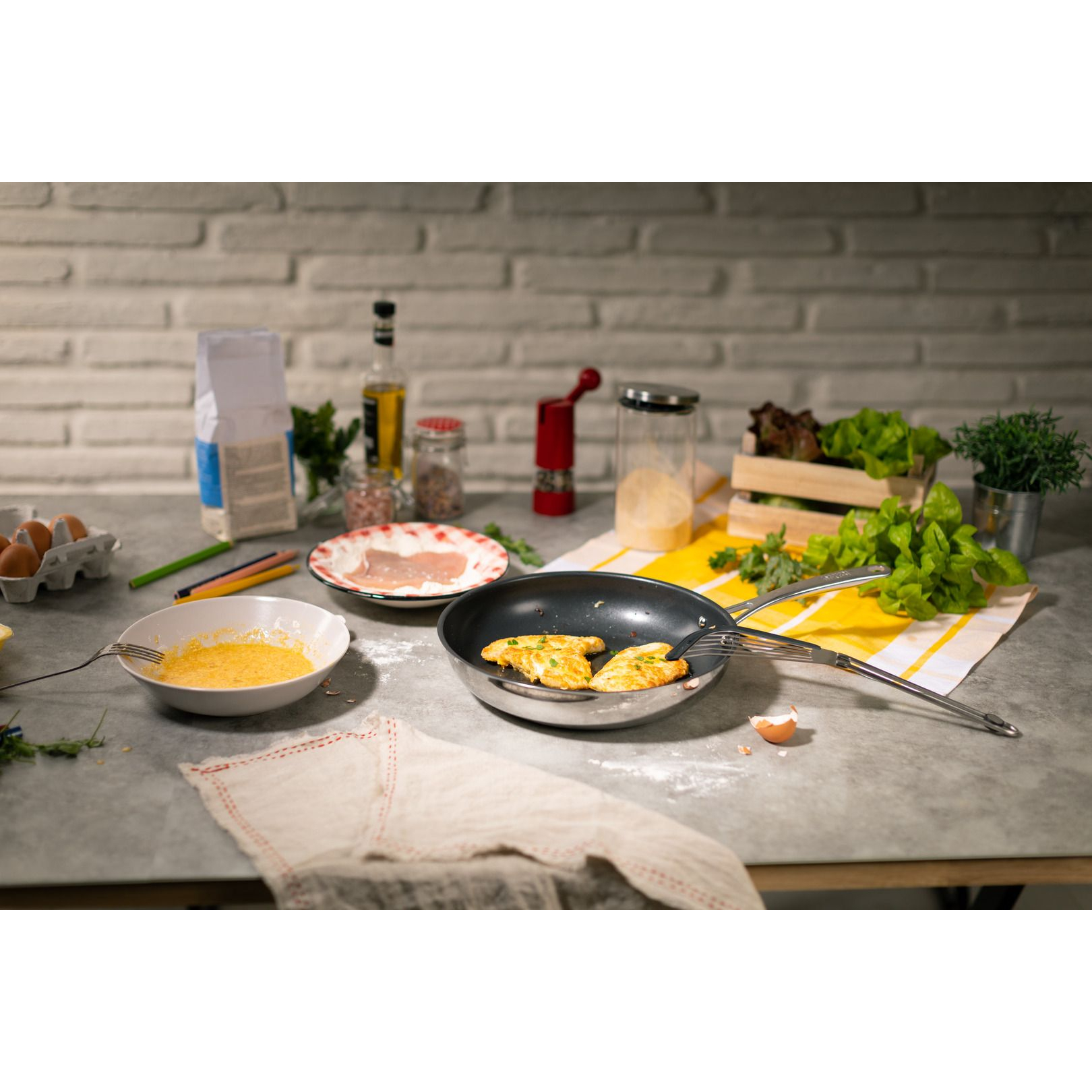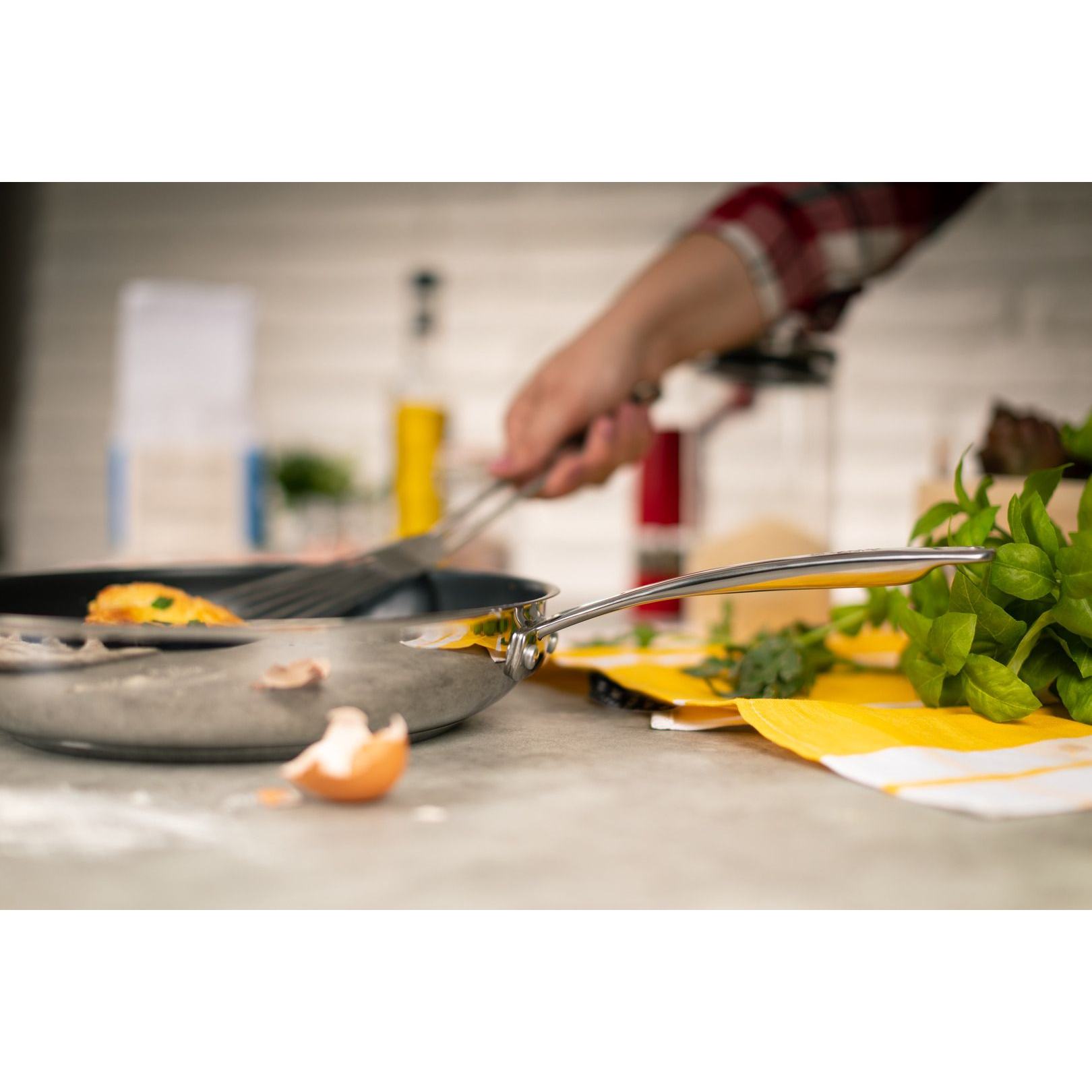 Ideal for low-fat cooking, its three-layer non-stick coating reinforced with titanium particles delivers excellent release and durability.