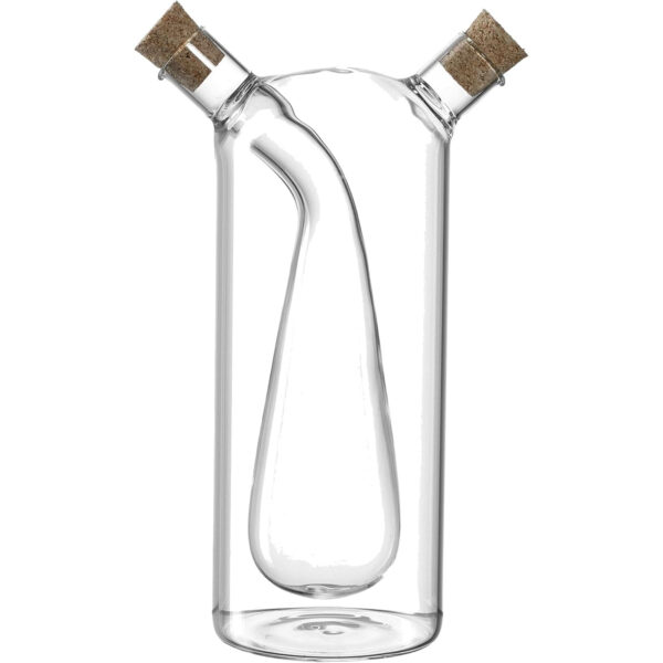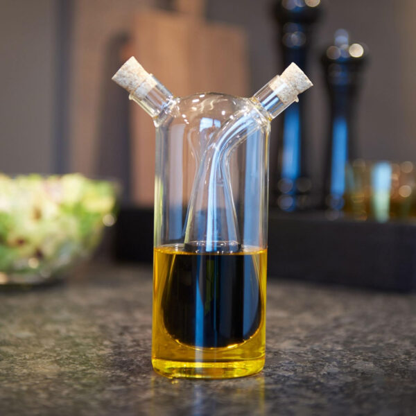 – Usage: Dual‑pour bottle featuring two spouts—one for oil, one for vinegar—each sealed with a small cork for freshness