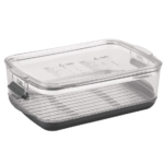 – Grooved colander base for draining excess water, see-through to keep your fridge organised