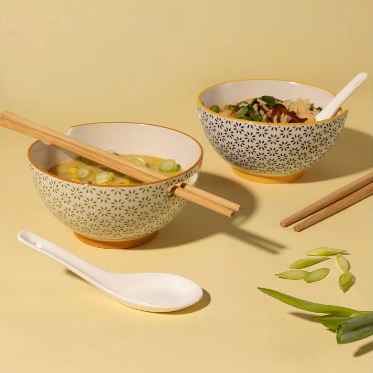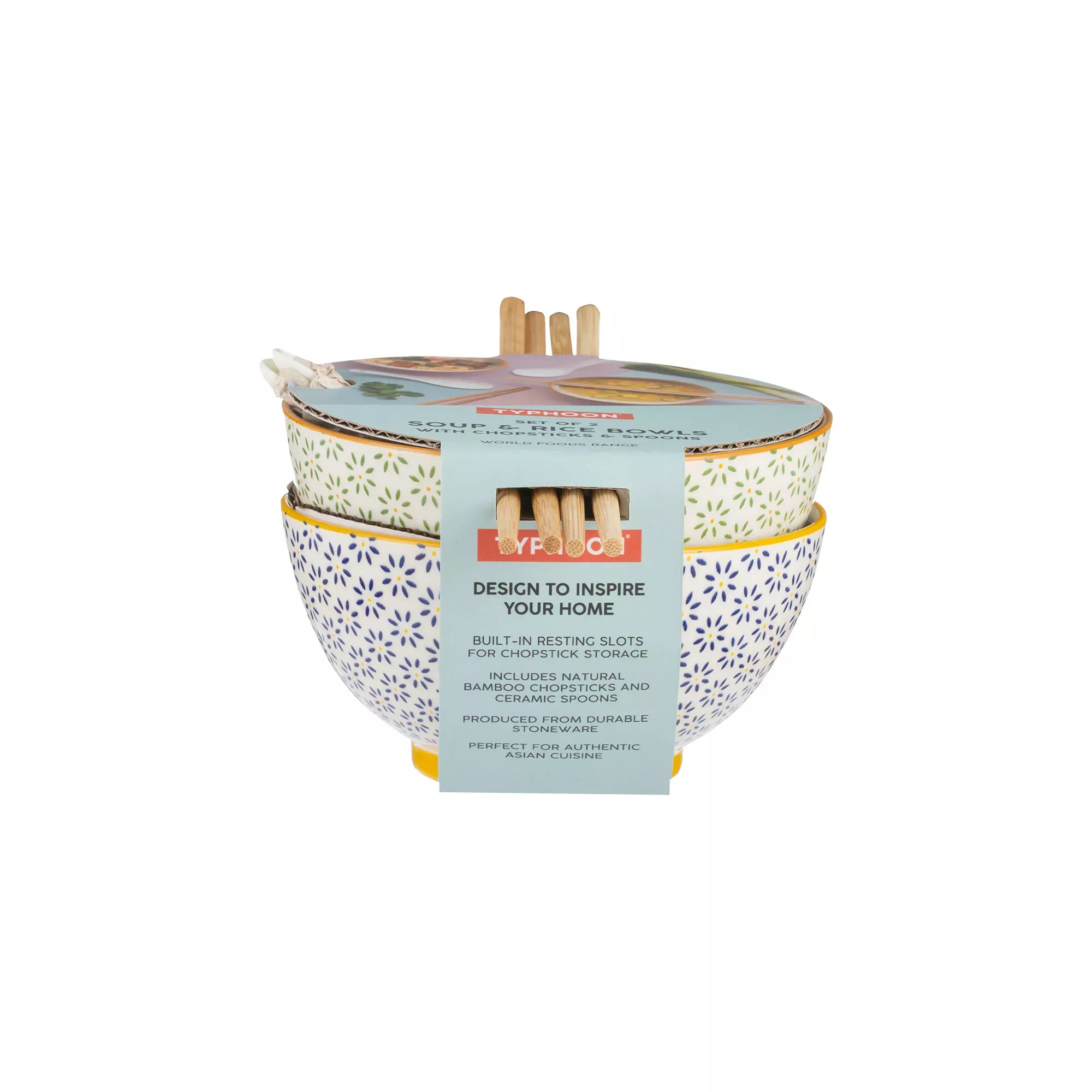 This set includes two intricately designed ceramic bowls, each accompanied by a pair of bamboo chopsticks and a traditional soup spoon.