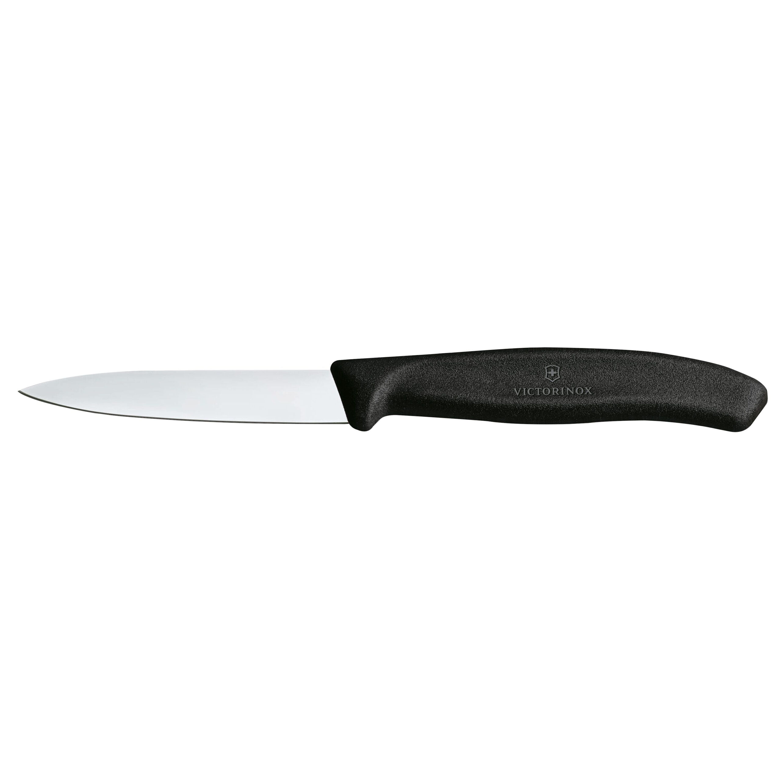 – Material: Martensitic stainless-steel blade (Victorinox European steel) with straight edge. Handle in polypropylene (PP), black.