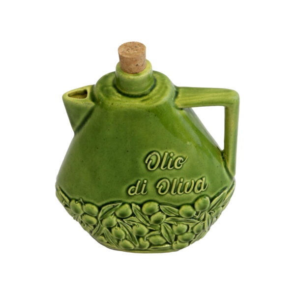 – Design: conical body with side handle and embossed “Olio di Oliva” wording plus olive motif